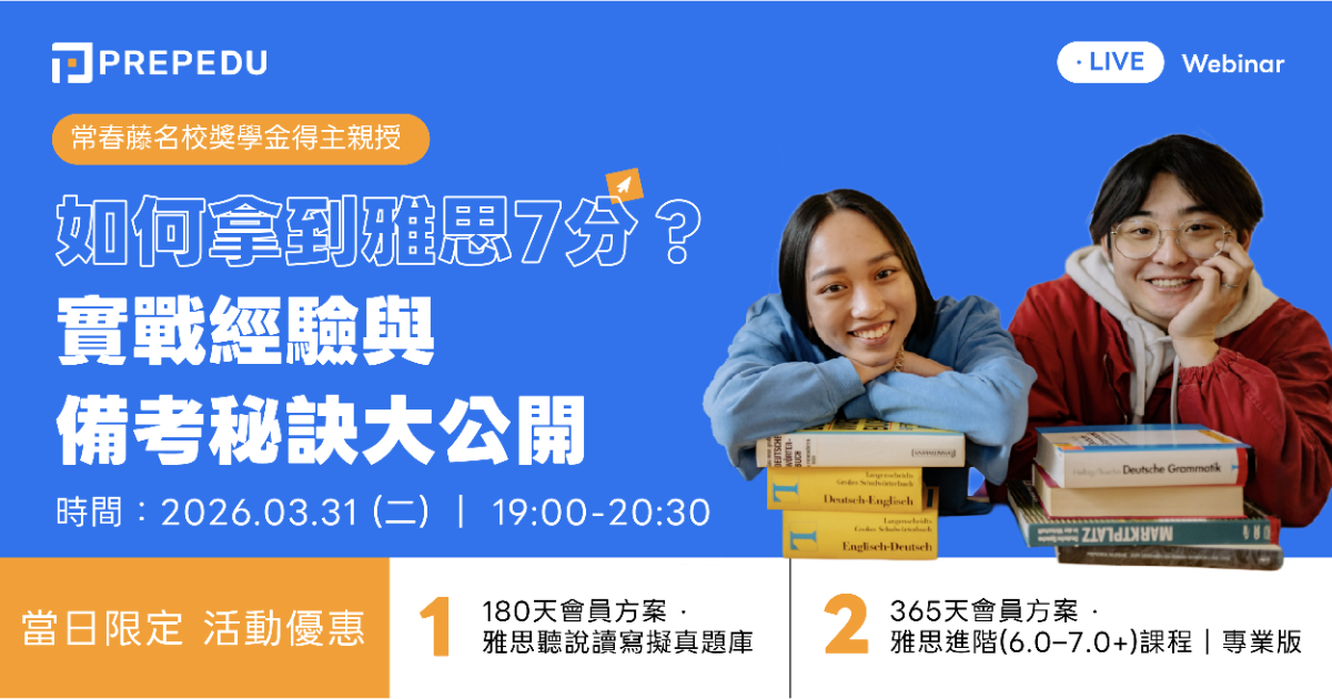 想衝雅思 7 分,但不知道從哪裡開始?Prep Edu 特別邀請實戰考到 7 分以上的 Roxanne。時常在社群分享語言學習經驗的她,將透過這次的機會分享自己的備考歷程,以及聽說讀寫四科的準備方式,學會「有策略」地準備考試。